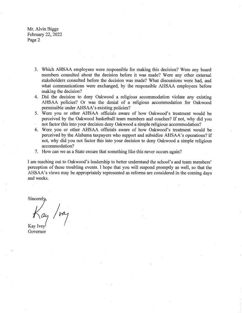That is when Alabama Governor Kay Ivey became involved in the situation. The Governor sent a letter to the AHSAA asking for answers to why the Mustangs request was denied.