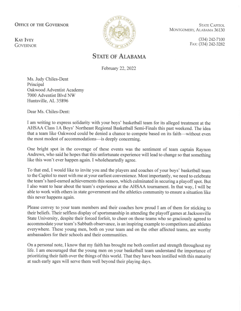 (2-25-22) Oakwood Adventist Academy is a Seventh-Day Adventist school in Huntsville, Alabama located 100 miles north of Birmingham. The boy’s basketball team had advanced to the semifinals of the state tournament last week and was scheduled to play Faith Christian. It was their first-ever regional tournament appearance.