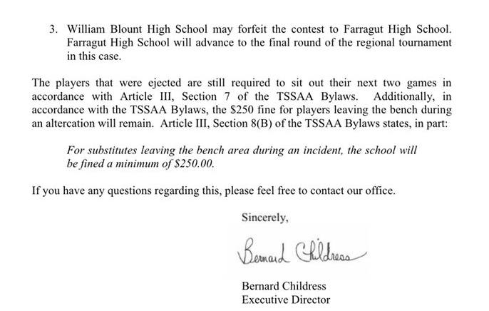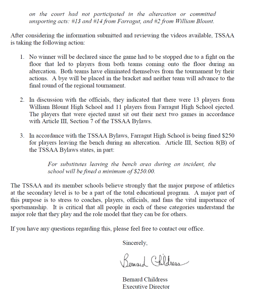 The schools were given two options by the TSSAA: Play the remaining 1:38 with the players who were not ejected, or agree to end the game and declare Farragut the winner.