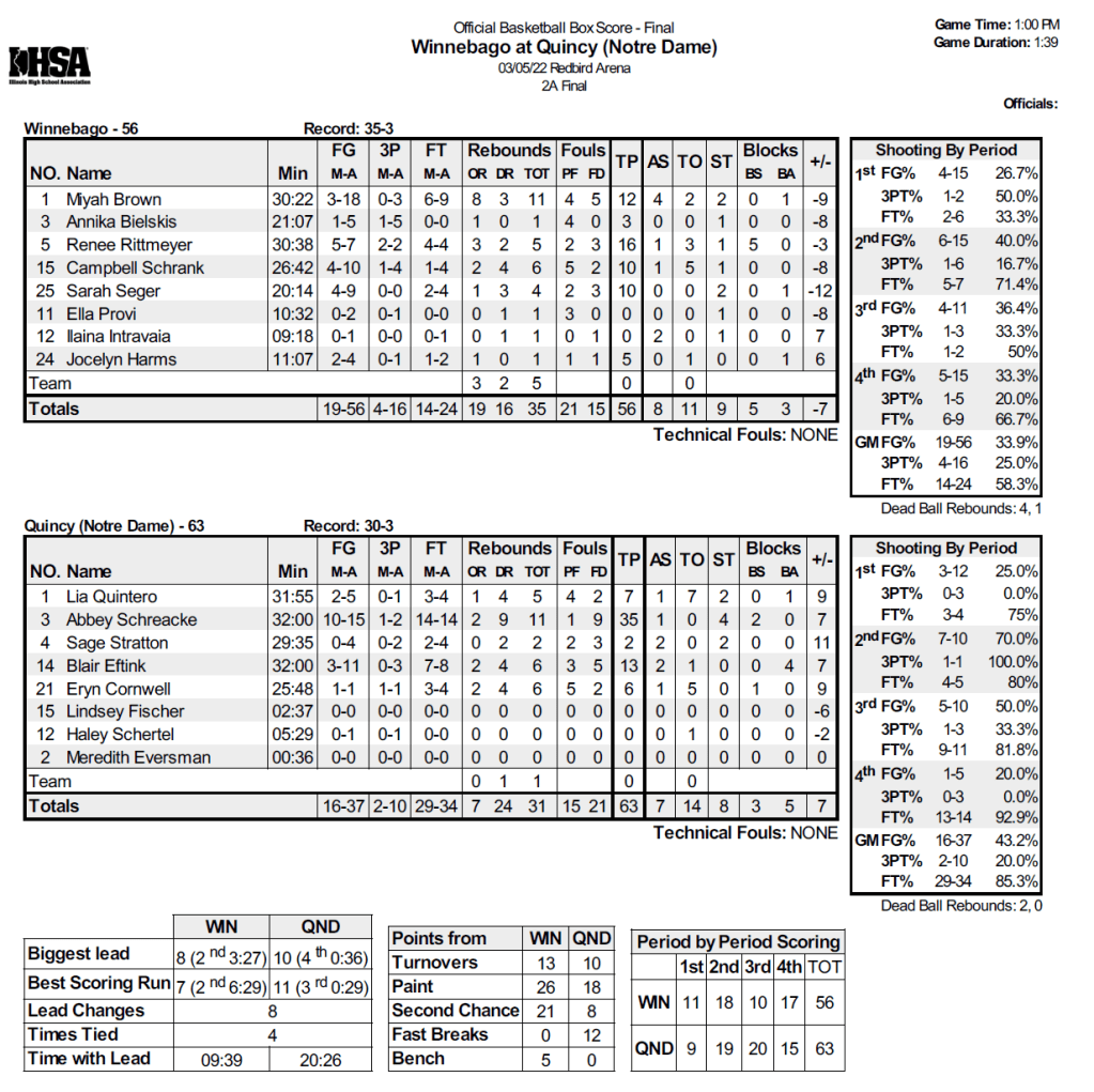 (3-5-22) Winnebago ends one of the best girls basketball seasons in school history. The Indians made it to the IHSA 2A championship game…but fell just short today losing to Quincy Notre Dame 63-56. Winnebago ends the season with 35 wins, all three of their loses came to private schools, including today’s loss to QND, Peoria Notre Dame and St. Viator.