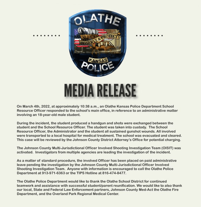 Three men were injured in the shooting, including school resource officer Erik Clark, assistant principal Kaleb Stoppel and Elmore. Later in the day Clark and Stoppel had been released from Overland Park Regional Hospital. As of Saturday morning Elmore remained hospitalized in critical condition.