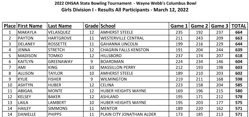 (3-13-22) Celina’s Ashtyn Huber finished 10th overall as an individual at the OHSAA Division I State Girls Bowling Tournament to earn All-Ohio second team honors.