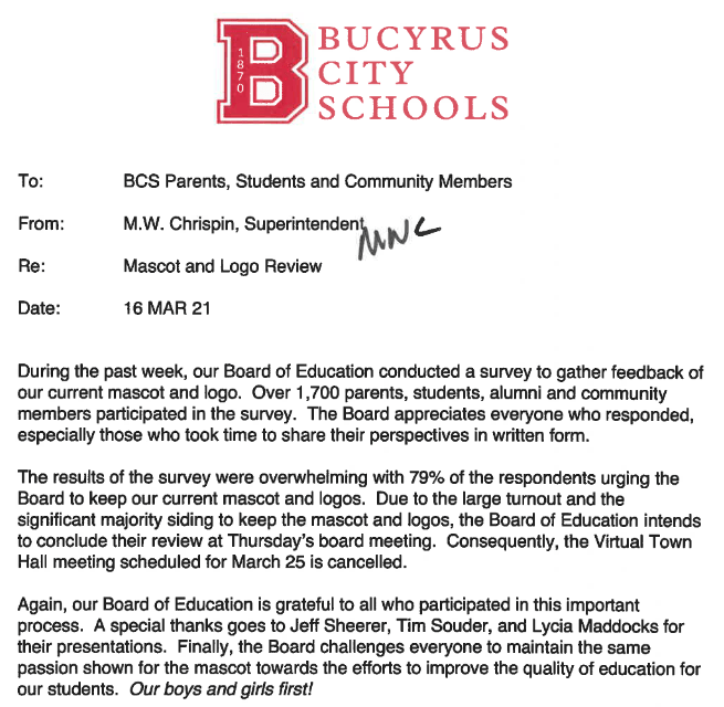 (4-9-22) In March of 2021 a public survey of more than 1,700 respondents found 79% of the community wanted to keep the ‘Redmen’ mascot. Bucyrus City Schools Superintendent Matt Chrispin, a Celina graduate, said that the school mascot is a source of pride at Bucyrus and in similar small Ohio communities.