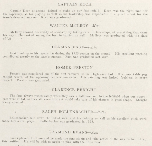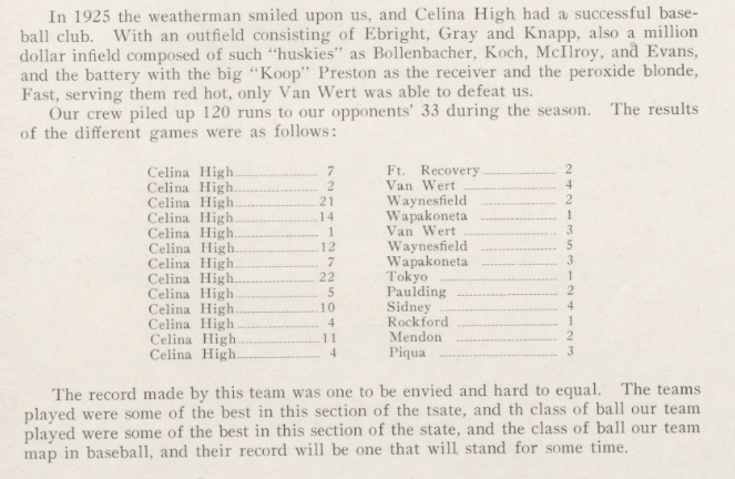 The 1925 Celina High Bulldogs, led by Coach JA Malick, had a season to remember. The only loss they suffered according to the Hi-Li-Ki yearbook of 1926 (spring sports from 1925 appeared this year) was to Van Wert 3-1. They finished the season 12-1. There was no state tournament at that time, the first year the OHSAA sponsored one was in 1928.