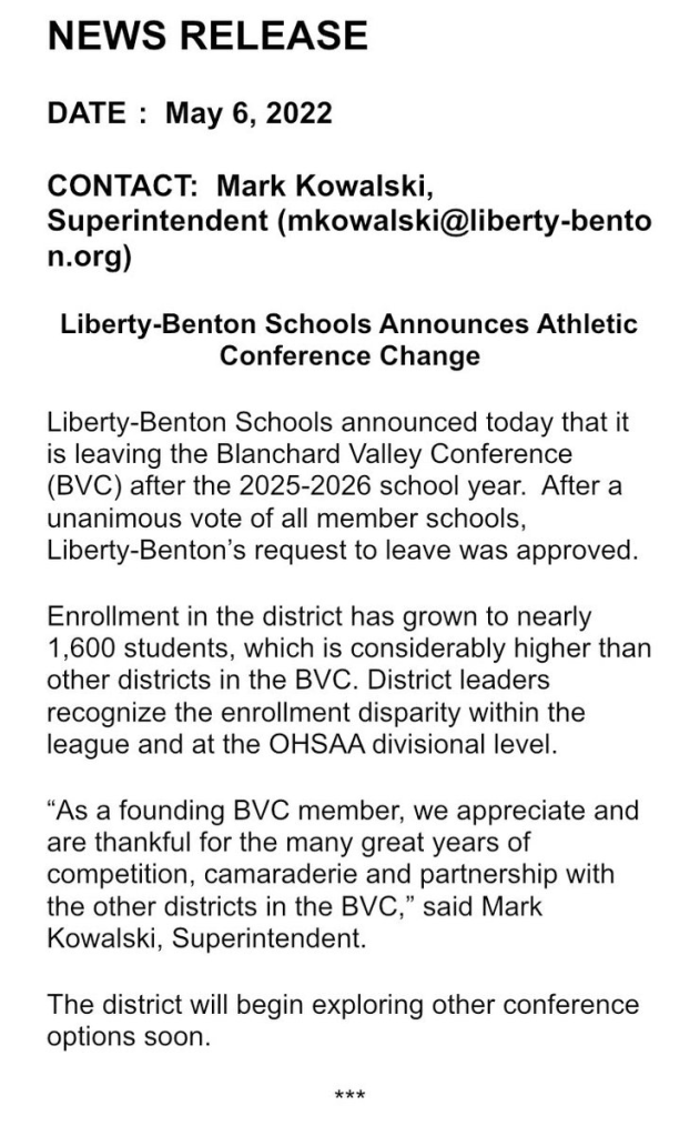 (5-6-22) Sources say that Liberty-Benton will announce today that it is withdrawing from the Blanchard Valley Conference.