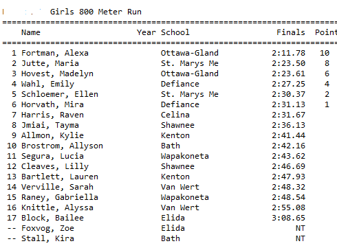 O-G’s Alexa Fortman broke the 800 m record, which was set in 1981, winning in a time of 2:11.78, breaking the previous league record of 2:16.80. She also won the won the 400 m (58.35), and was the anchor in the winning 1,600 relay team.
