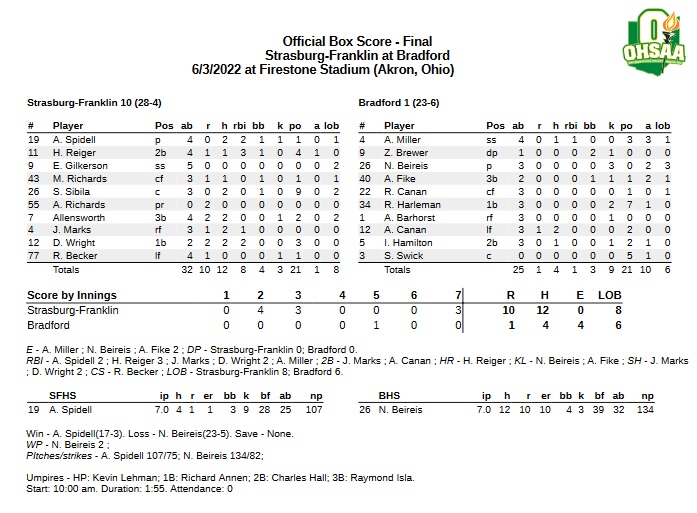 In the first D IV semifinal game today Strasburg-Franklin rolled to a 10-1 win over Bradford to advance to the D IV Championship game tomorrow against Lincolnview.