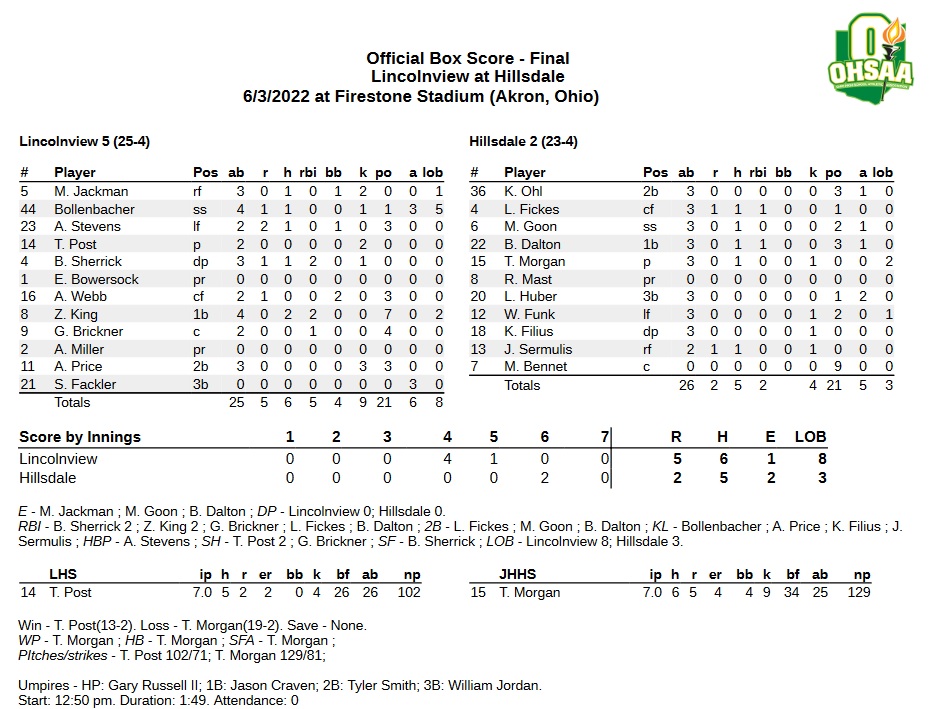 Lincolnview (25-4) was led by Zadria King who had 2 hits and 2 RBIs, Braxton Sherrick went 1 for 3, scored a run and had 2 RBIs. Taylor Post (13-2) picked up the complete game pitching win striking out 4 and she didn’t walk a batter.