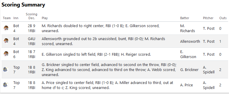 Both teams would manage just 5 hits a piece. Amelia Spidell (18-3) would pick up the complete game pitching win striking out 8, walking 2 and both Lancer runs were unearned. Taylor Post (1-3) would be charged with the loss, giving up just 1 earned run striking out 3 and no walks.