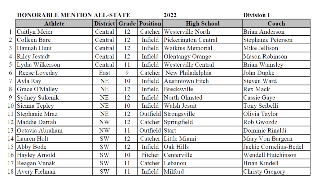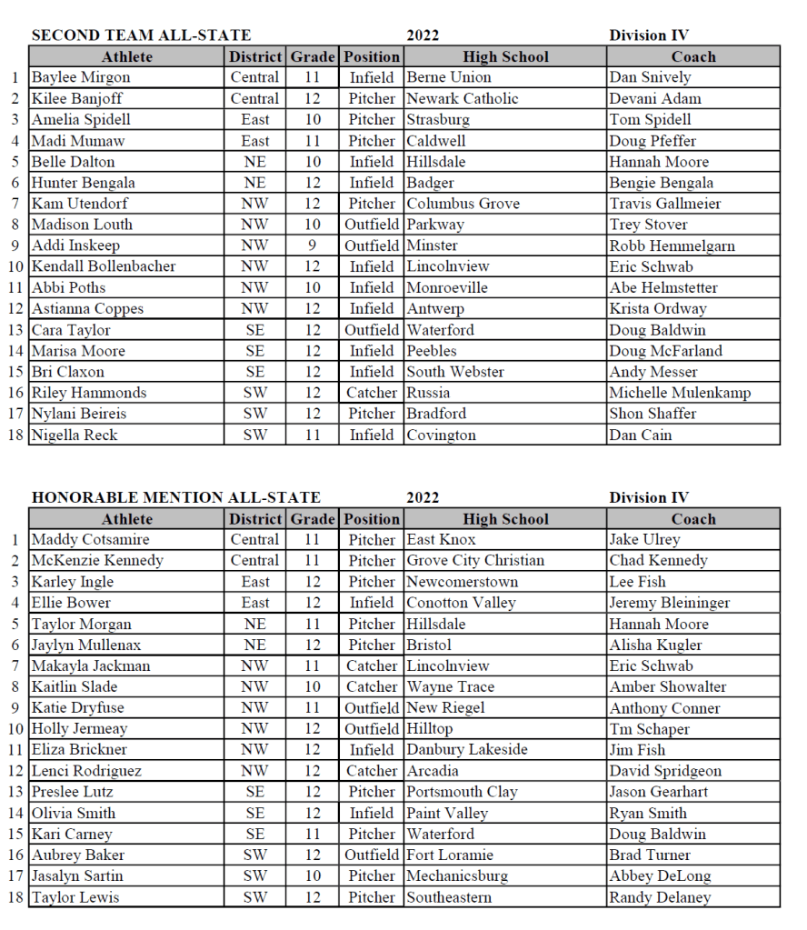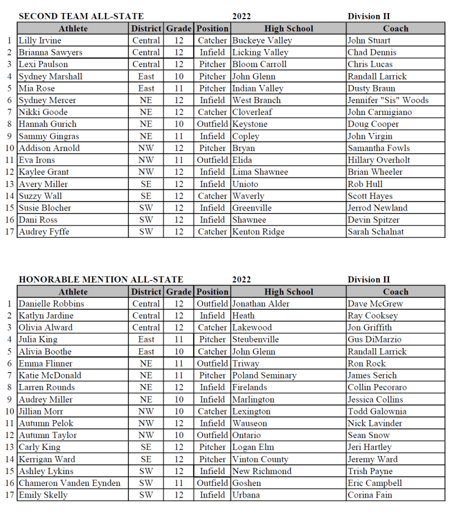 (6-7-22) The The Ohio High School Fastpitch Softball Coaches Association (OHSFSCA) 2022 All-Ohio Softball Teams have been named.