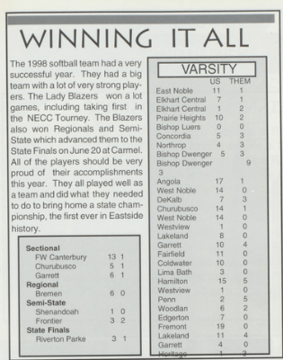 In 1998 Eastside softball won the IHSAA Class A State Championship