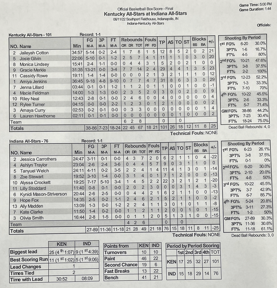 (6-11-22) The Kentucky All Star team after losing a heart-breaker in Owensboro last night came back strong on the road in Southport knocking off the Indiana All Stars 101-76. It is the 2nd year in a row the Kentucky All Stars have won the game played in Indiana.