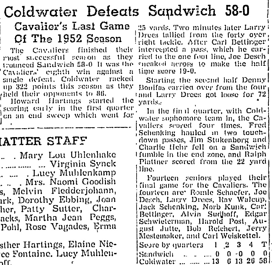 On November 11th, 1952 in Sandwich, Coldwater picked up a 58-0 win- (Mercer County Chronicle)