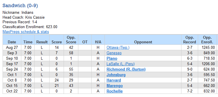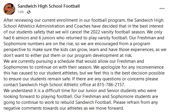 (6-17-22) Yesterday in a post on the Sandwich HS football Facebook page it was announced that the 2022 football season had been cancelled.
