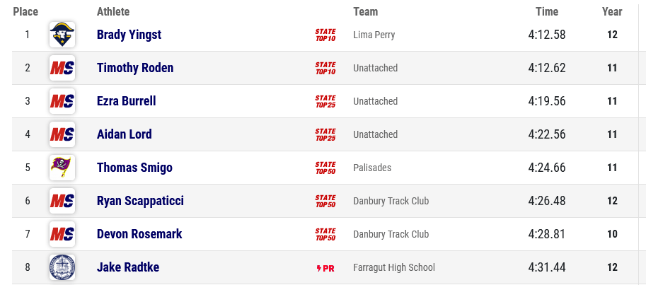 Yingst edged out 2nd place finisher Timothy Roden (Central Dauphin HS, Harrisburg, PA) by .04 seconds.