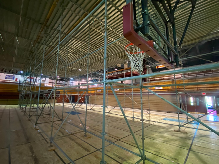 This is a huge project that will put the MHS gym out of commission for most of the summer. Construction began after seniors walked across the stage in early June. the plan is to have everything completed by August. The first phase was to put plywood over the floor as a protective barrier for pieces that fall and equipment that is moved. Then hundreds of feet of scaffolding was built around the perimeter of the floor. During the removal, people will not be allowed into the building and workers will have to wear protective gear for the harmful dust particles and debris that will be in the air. After the removal, professionals will come in and change the lights and paint the rafters so everything looks like new. As new as a 99 year old gym can look.