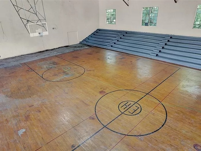 Rare opportunity for your very own high school gym, built in 1950. This is an honest to goodness treat. Former Wilkinson HS Gym has 1/2 court with original basketball goal & original maple flooring–approx 5,984 sq ft. New living space with huge rooms has been added to balance of building in the last 20 years. Furnace, and a new roof north 1/2 of gym, within two years. Was zoned commercial, now residential. Would make fantastic day care or home for the basketball enthusiast. Cell tower lease is paid in full, can provide copies of lease. All building measurements & dimensions to be verified & approved by buyer.
