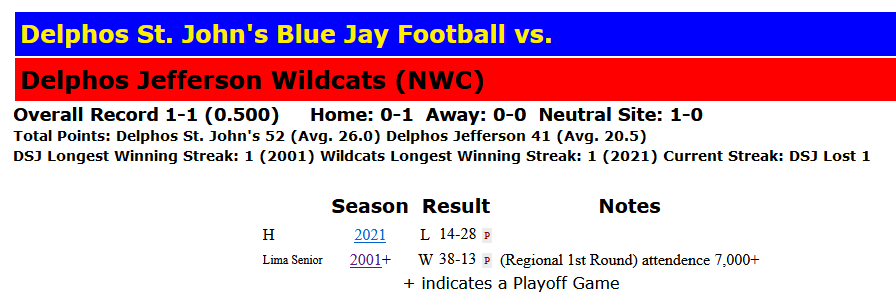 The first game the two ever played, thanks to the OHSAA, was in a 2001 playoff game that was won by the Blue Jays 38-13.