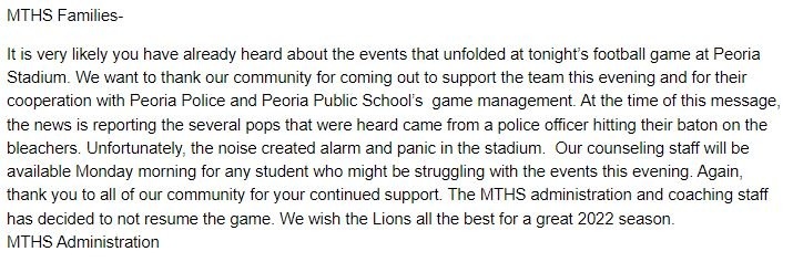 Peoria, Illinois (8-27-22) — The football game last night between Peoria High and Metamora Township was stopped after a fight in the home grandstands broke out and ‘possible’ shots fired were detected at Peoria Stadium.