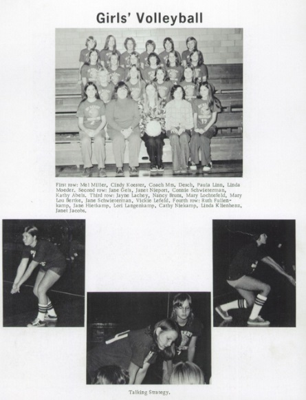The first Redskins’ Coach of the program was Barb Desch. Desch was a Physical Education teacher. The St. Henry yearbook included just one page about the 1974 team, no details or scores were mentioned. –