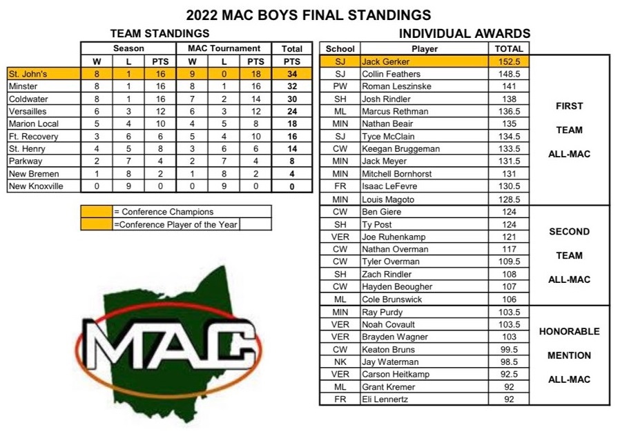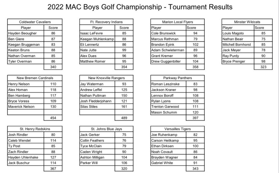 (9-25-22) Delphos St. John’s captured the 2022 Midwest Athletic Conference (MAC) tournament yesterday held at the Celina Lynx. With that win they also collected the MAC Championship edging out Minster and Coldwater who finished in 2nd and 3rd place.