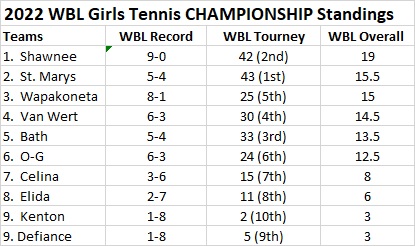 1. St. Marys 43, 2. Shawnee 42, 3. Bath 33, 4. Van Wert 30, 5. Wapakoneta 25, 6. Ottawa-Glandorf 24, 7. Celina 15, 8. Elida 11, 9. Defiance 5, 10. Kenton 2