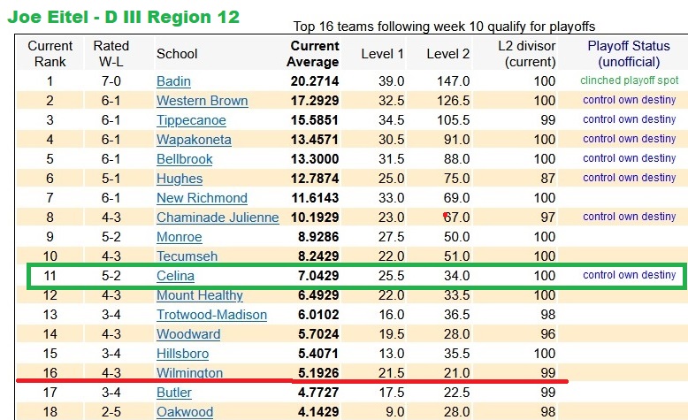 This is the 2nd season that the OHSAA playoffs include 16 teams from each region. Celina, who is in D III, is presently 5-2 on the season and in the 11th qualifying slot. There are 27 teams that comprise Region 12.