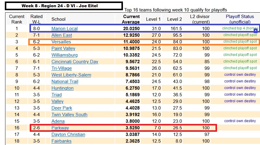 In D IV Region 14…Van Wert (7-1) is ranked at #5 and has clinched a playoff spot, while St. Marys (6-2) is ranked at #7 and has also clinched a playoff spot.