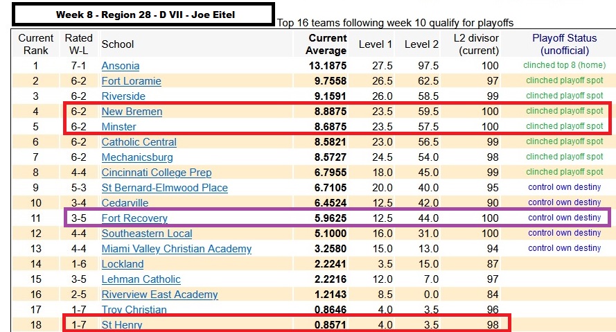 In D VII Region 28…Eitel says both New Bremen (6-2) and Minster (6-2) have cliched playoff spots, Ft. Recovery in the #11 spot controls their own destiny with a 3-5 record.