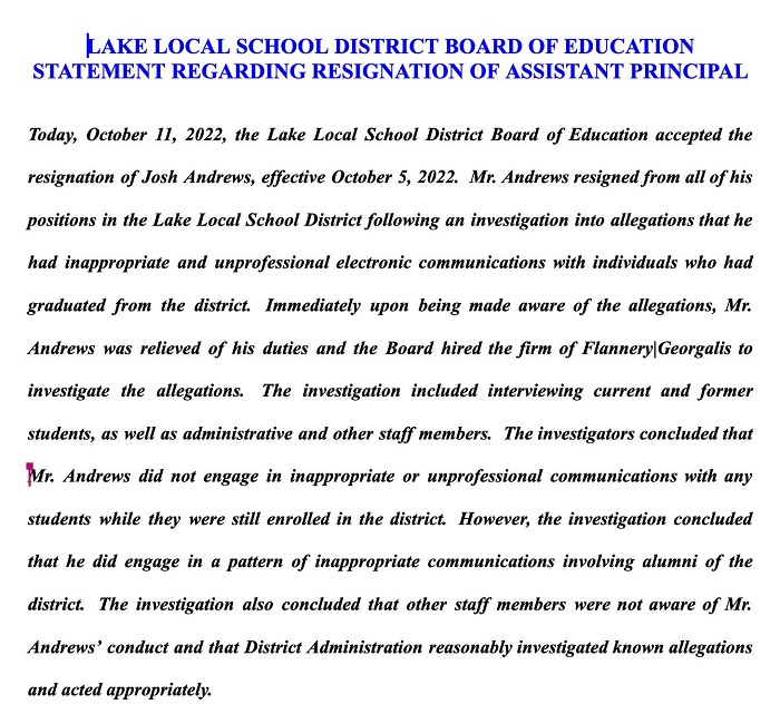 (10-12-22) Josh Andrews, the Lake High School football head coach and assistant principal was placed on leave on September 19th for “improper communications” has resigned from his positions in the school district effective October 5th.