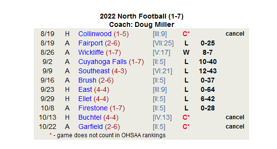 (10-14-22) 1st year Akron North Head Football Coach Doug Miller and North’s athletic director, Carrie Stewart, reached the decision to suspend the remainder of the football season on Tuesday. Entering the season, the Vikings had 28 players on the roster…eligibility and injuries left the roster to around 15 players.