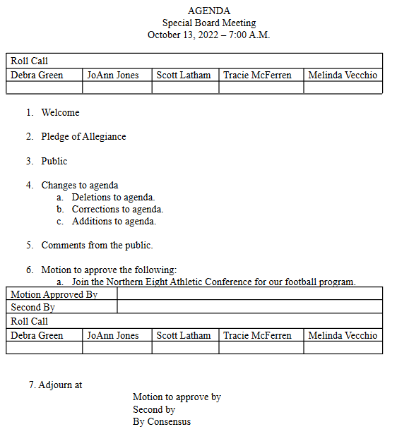 (10-14-22) The Sebring Local Schools Board of Education voted 5-0 last night to approve a proposal from first-year football coach and athletic director Anthony Agresta to switch from 11-man to 8-man football and petition the Northern 8 Football League for membership.