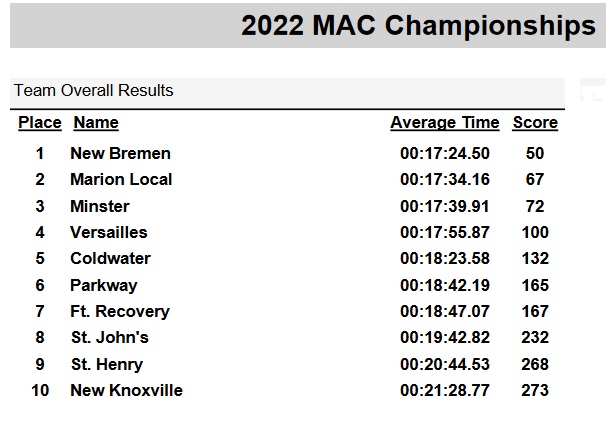 New Bremen picked up the MAC boys cross country title outdistancing Marion Local 67-50, with Minster in 3rd place with 72 points. It was the just 2nd title for the Cardinals, the last one came in 2008.