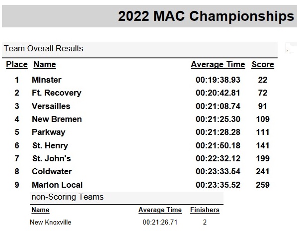 Minster adds another MAC girls cross country title with an impressive 22 points, Ft. Recovery was 2nd with 72 points.