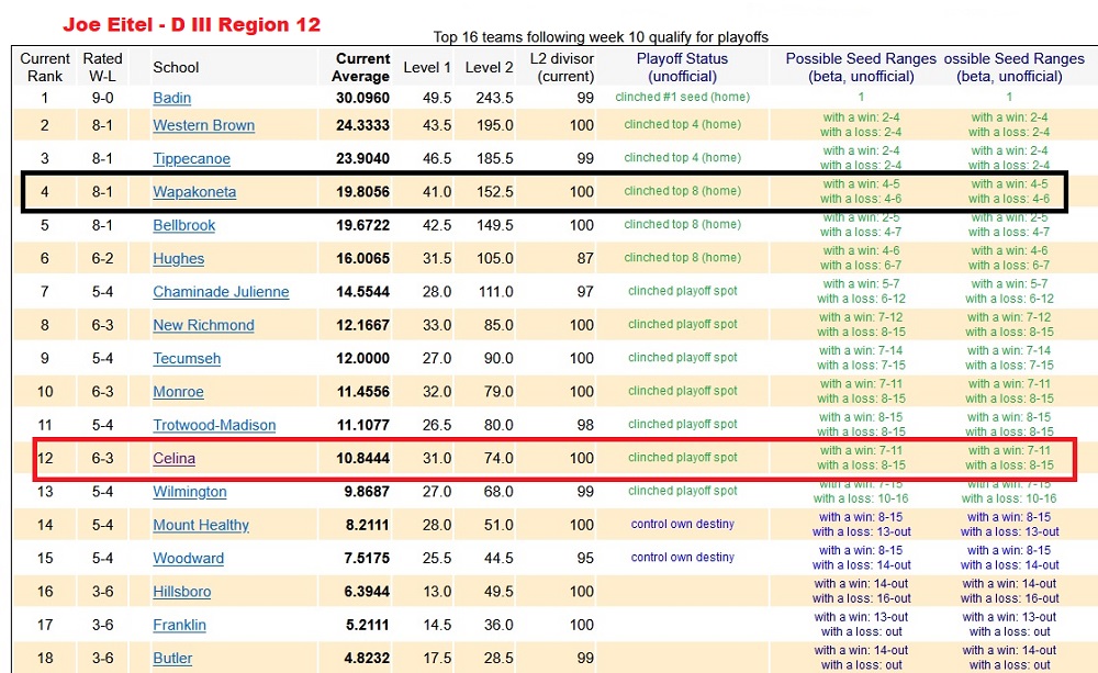Celina (6-3) despite a Homecoming loss to WBL rival Wapakoneta (8-1) (ranked 4th in Region 12), according to Joe Eitel, has clinched a D III Region 12 playoff spot. The Bulldogs end the season in the Battle of Grand Lake against D IV St. Marys (7-2) with some huge implications for Celina. A win over the Roughriders, according to Joe Eitel, might give them a home game. A loss would almost guarantee a 1st round road trip.