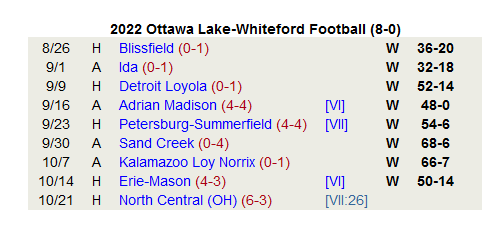 They finish the season with Ottawa Lake-Whiteford (8-0) who has dominated against a very tough Michigan schedule.