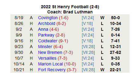 (10-22-22) St. Henry entered last night’s game with next-door neighbor Ft. Recovery with a 1-8 record. The Redskins would pull out a 22-21 nail-biter win and with that would qualify to play in the OHSAA football D VII playoffs.