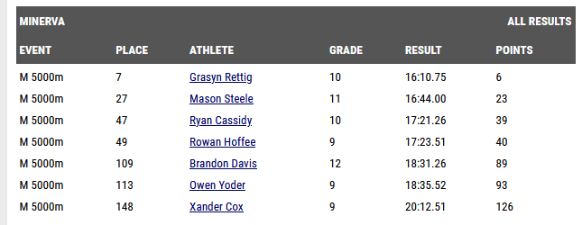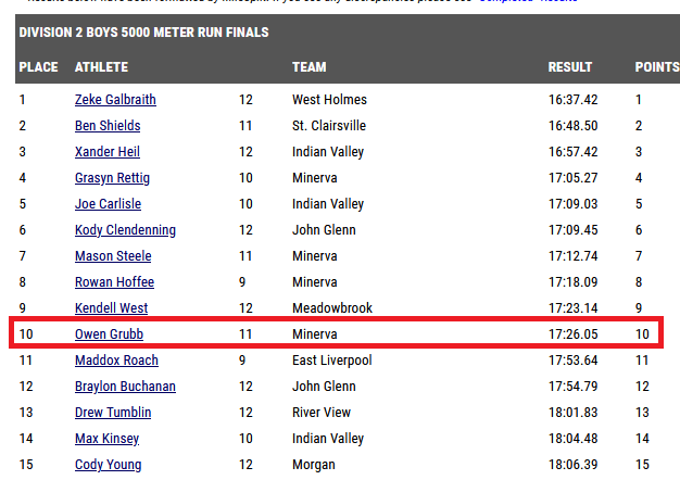 (10-29-22) Last Saturday at the D II District Cross Country Meet in Cambridge the Minerva boys team would place 2nd and Owen Grubb (Junior) finished in 10th place. Minerva qualified for today’s Regional meet in Pickerington.
