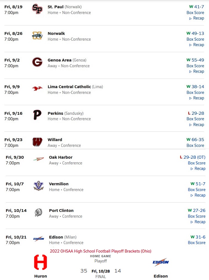 Huron has a 9-2 record…they lost both games this season by just one point…losing to Perkins 29-28 and Oak Harbor 29-28 in OT.
