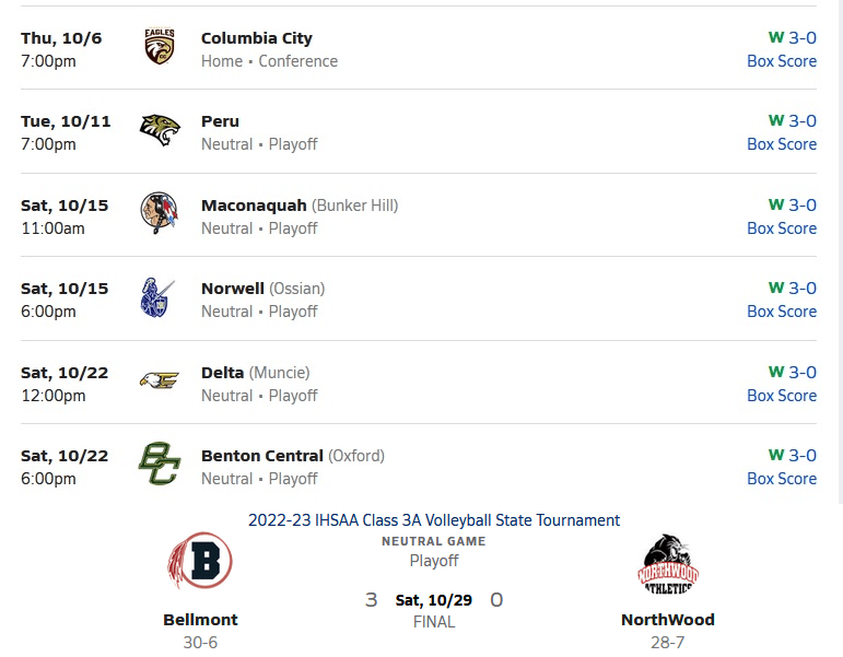 Bellmont (30-6) will play Providence (30-6) for the Class 3A state championship next Saturday, Nov. 5 at Worthen Arena on the campus of Ball State University.