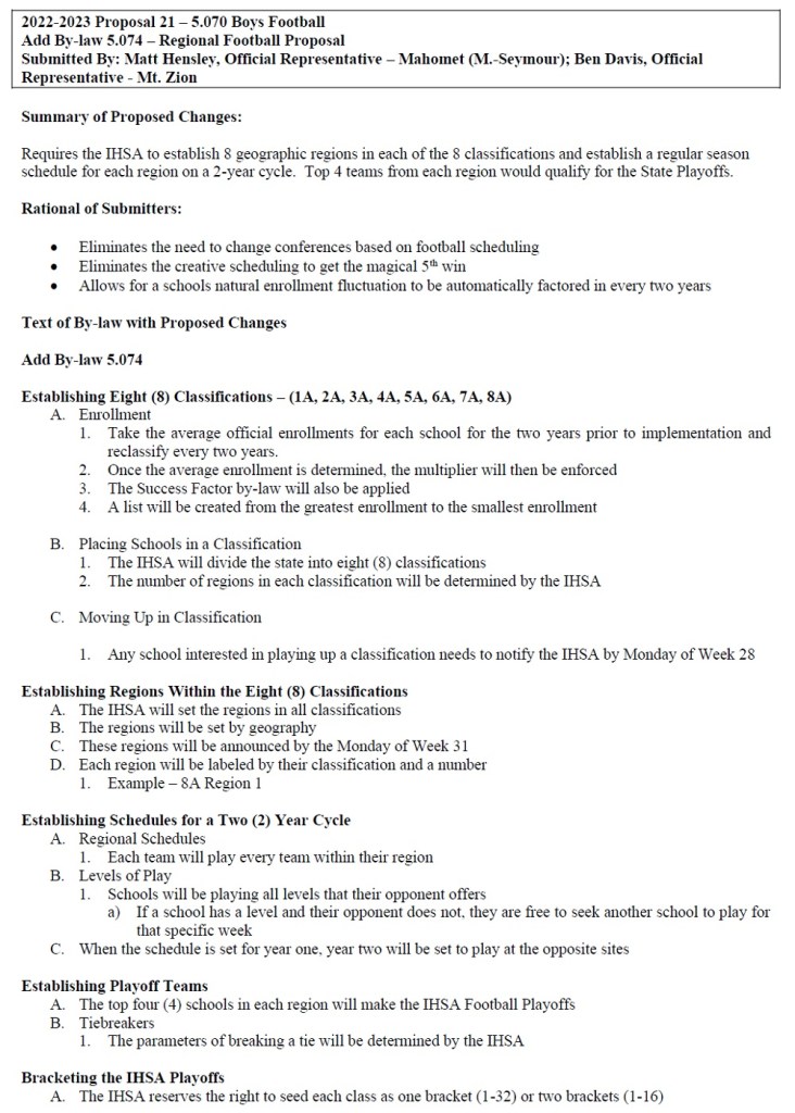 Over the past several years the IHSA has turned down plans to have regions in football established, one time they passed it and then overturned it after having 2nd thoughts.