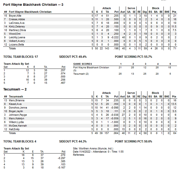 (11-5-22) It took five sets but Blackhawk Christian is the IHSAA 1A State Volleyball Champions knocking off Tecumseh 21-25, 25-13, 12-25, 25-20, 15-5.