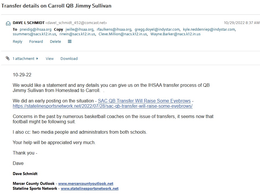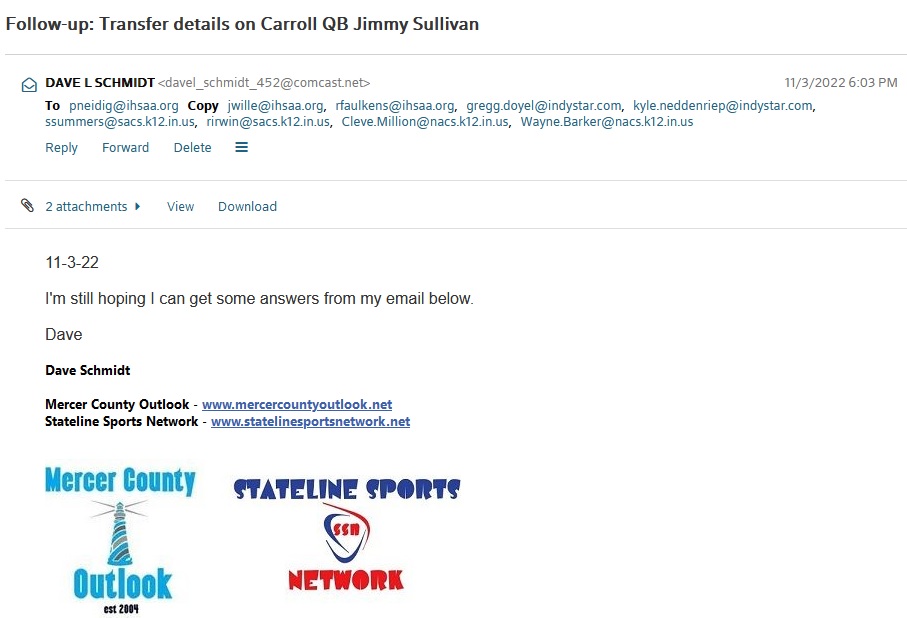 (10-29-22) In an attempt to clarify the process of the transfer of a top rated Sophomore Homestead QB to Carroll…an email from SSN to the IHSAA leadership and both schools administrators involved in the transfer was sent…to this point all we have heard are the crickets chirping in the background.