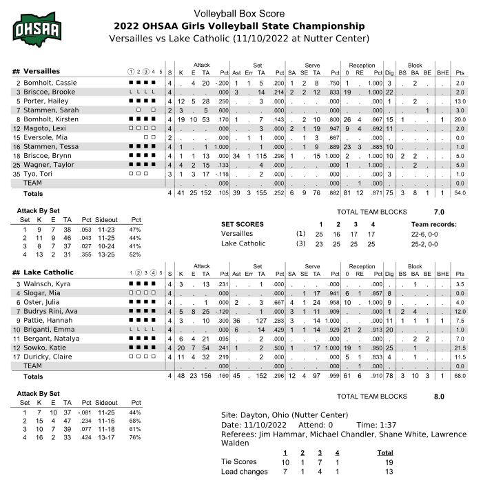 Versailles lost in the other semifinal game to Lake Catholic in four sets 23-25, 25-16, 25-17, 25-17 to end their season.
