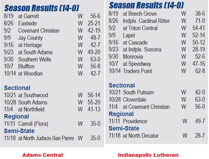 The two teams both have 14-0 records. Only one common opponent, during the regular season Adams Central beat Covenant Christian 42-19, while Indianapolis Lutheran beat them in the playoffs 56-0.