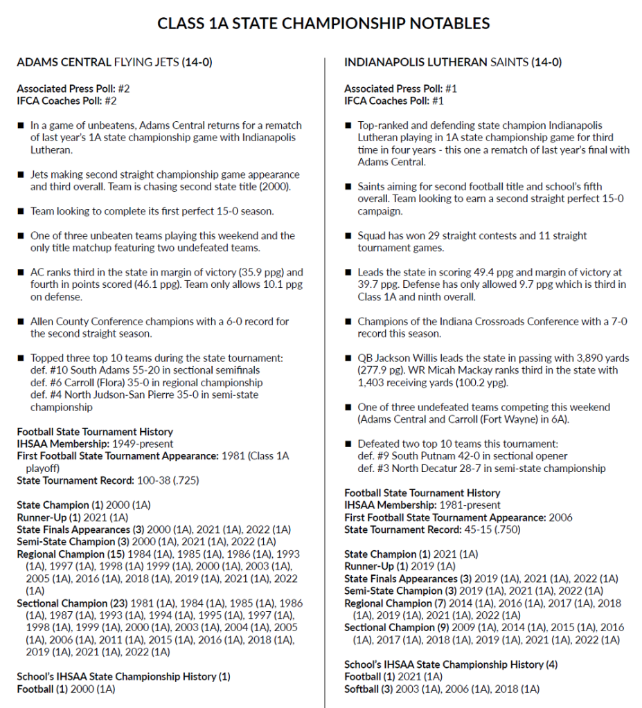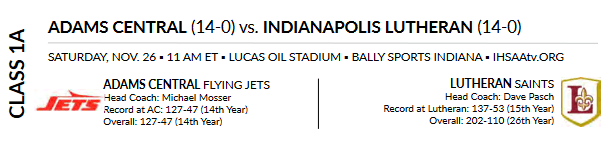 (11-23-22) The IHSAA Class 1A State Football Championship will be decided in a rematch of last season’s title game. In that game Indianapolis Lutheran finished a perfect season by overcoming a 14-point, first-half deficit to beat Adams Central, 34-28.
