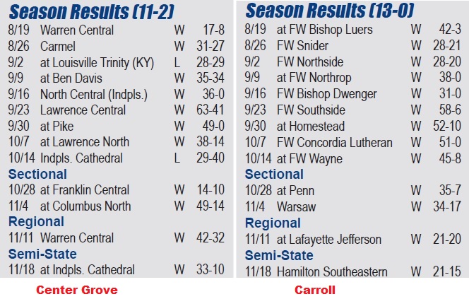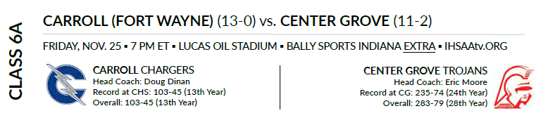 (11-23-22) Center Grove is looking to make it three consecutive Class 6A State Championships when they play the ‘new kids on the block‘ Carroll Friday night at Lucas Oil Stadium.