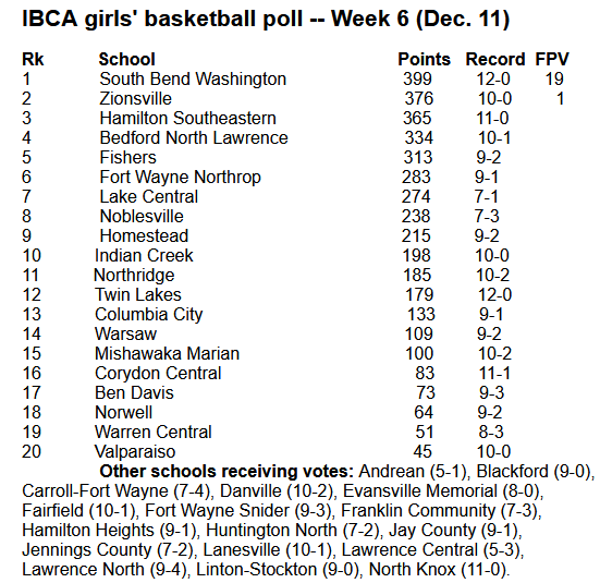 (12-11-22) Below are results of the IBCA girls’ basketball poll for Week 6 (Dec. 11) of the 2022-23 season.