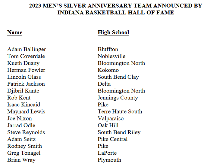 NEW CASTLE – Seventeen men have been named to the Indiana Basketball Hall of Fame’s 2023 Silver Anniversary Team, based on outstanding accomplishments as a senior basketball player 25 years ago.