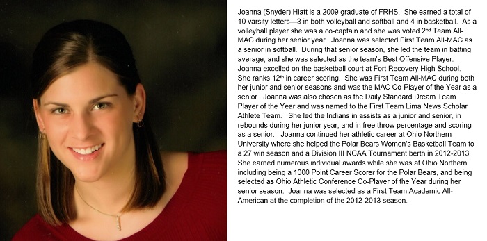 (12-27-22) The Fort Recovery High School Athletic Hall of Fame will add two new members, Jennia (Jenkins) Knestrick and Joanna (Snyder) Hiatt in its 2023 induction class. The induction ceremony will be held between the JV and Varsity Boys’ Basketball games scheduled for Saturday, January 28, 2023.